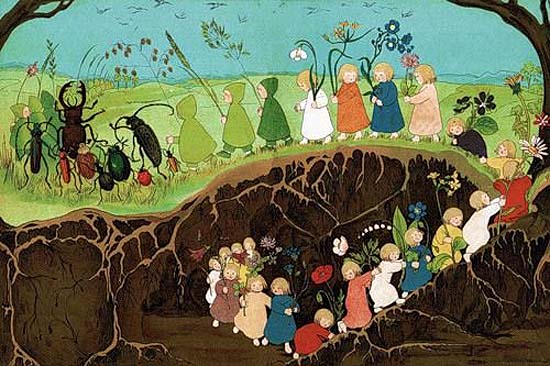 | Nun kommt ein jedes Wurzelkind und bringt sein Kleidchen ganz geschwind hinein zur guten Mutter Erde, damit’s von ihr gemustert werde. | And now every root child is coming and bringing her own little dress to good Mother Earth to put it under her scrutiny. |