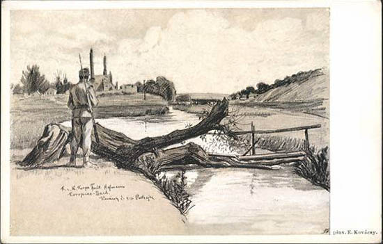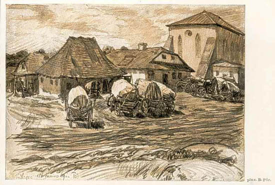 A found postcard about Podhajce with the synagogue. Drawing of the great Hungarian avant-garde painter of Jewish origin, Bertalan Pór, who worked as a front drawer in the First World War