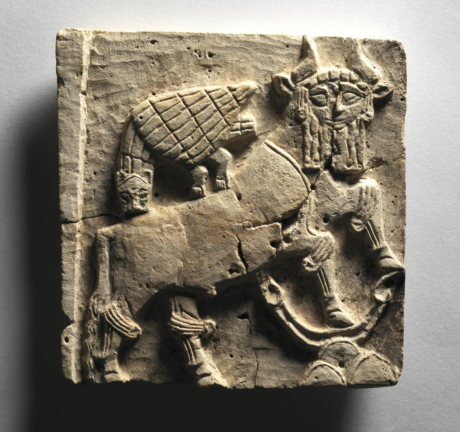 Anzu/Imdugud atacando un toro (quizá representación simbólica de la luna menguante), Tell-el-Obed, ca. 2600–2500 a.C., Penn Museum, Filadelfia