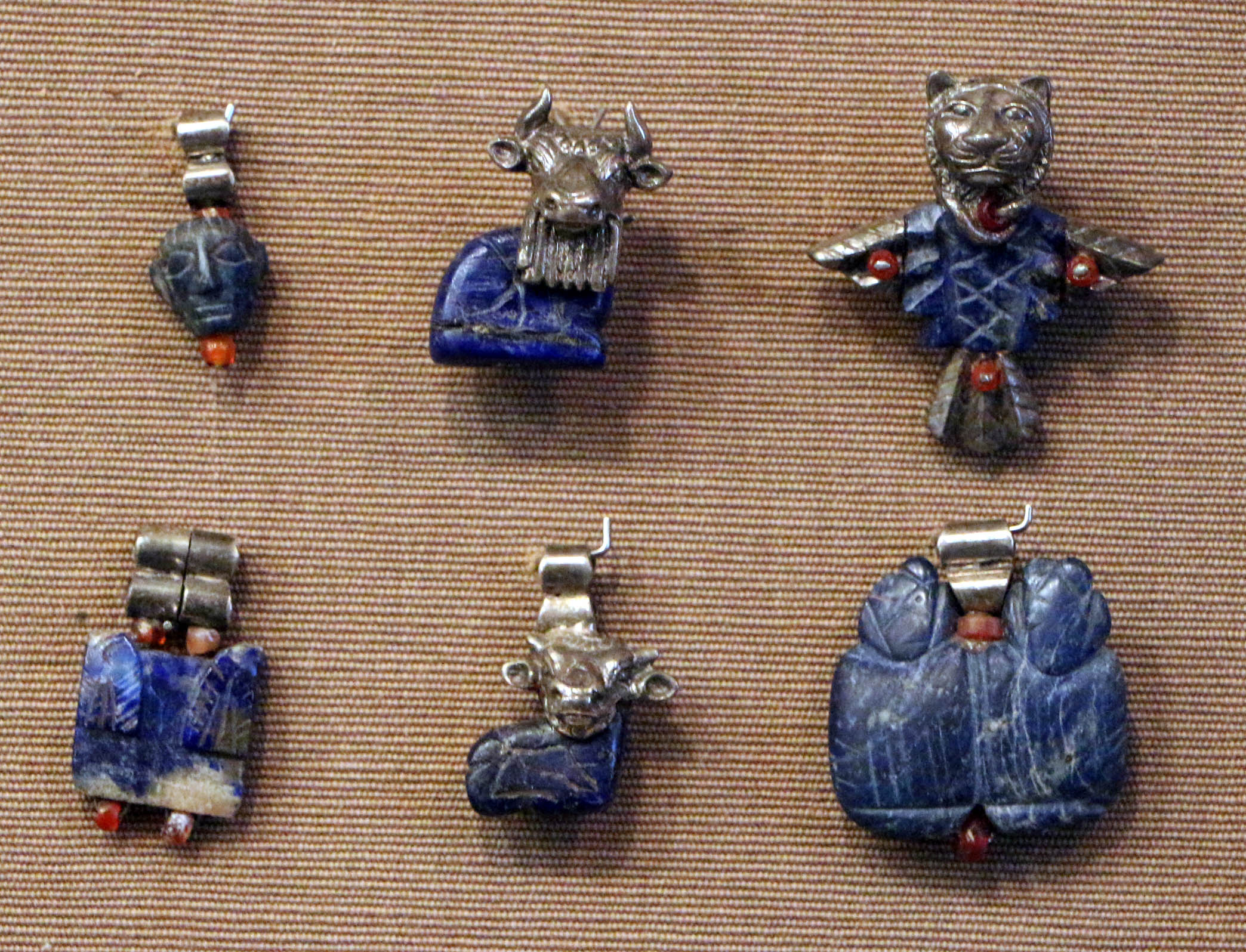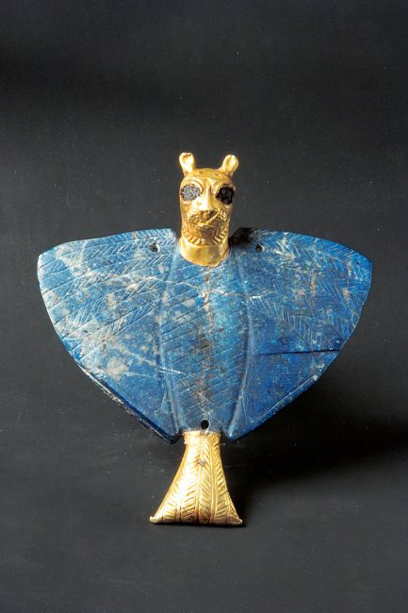 Anzu/Imdugud en un colgante de lapislázuli y oro del llamado «tesoro de Uri» descubierto en el palacio real de Mari (supuesto regalo del rey de Ur al rey de Mari), ca. 2500 a.C., Museo Nacional de Siria, Damasco