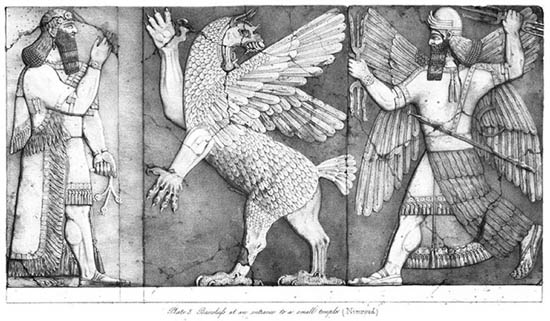 El combate entre Ninurta y Anzu en el relieve de la entrada del templo de la ciudad asiria de Nimrud, hoy en el British Museum. Grabado de Ludwig Gruner en Monuments of Nineveh, de Austen Henry Layard (1853). La descripción detallada del relieve puede leerse aquí