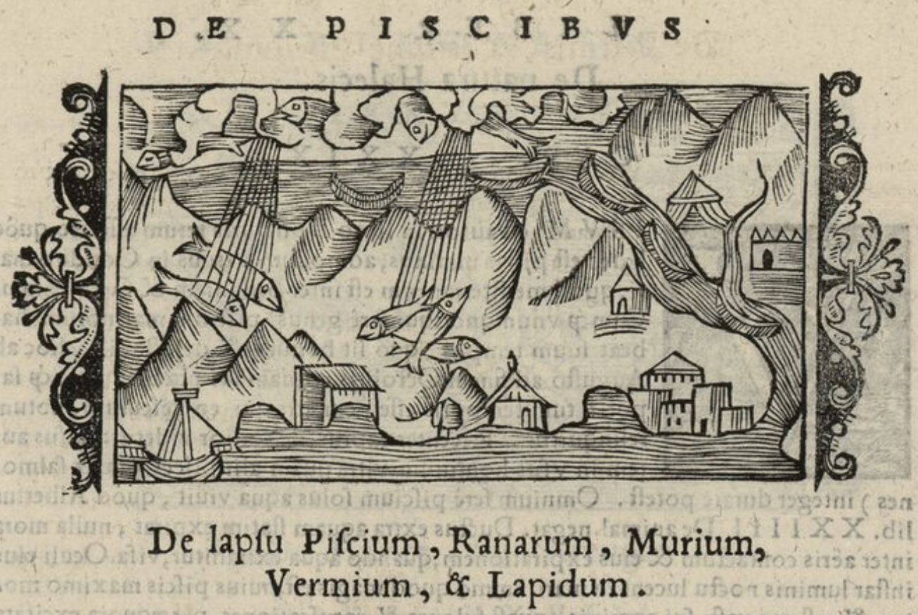 A veces los peces se nos vienen encima en forma de lluvia, como se asombraba Séneca en las Naturales Quaestiones («Quid quod saepe pisces quoque pluere visum est?...», I, 6, 2-4), o Ateneo en Deipnosophistae («Ferunt etiam pisces de caelo decidisse, ut in Paeonia et in Dardania, atque in regione Chaeroneae...», VII, 331e-f); y luego a su estela tantos relatos plagados de mirabilia desde la Edad Media al Barroco: Isidoro de Sevilla (Etymologiae XIII, 7, 7), Alberto Magno, Cardano, Kircher... O por ejemplo Olaus Magnus en su libro sobre las regiones inexploradas del Norte (1555):