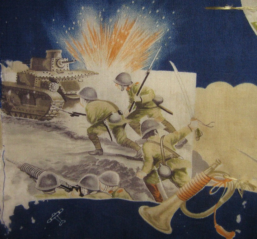 The visitors of the exhibition cannot decide whether on the second kimono the Japanese infantry assaults an enemy tank like kamikazes, for the machine gun of the tank turns towards them. However, weapon experts point out that the picture is a true representation of the Japanese tank I-Go, introduced in 1931, which also had a gun on the back. Just as the battleship above it is also a faithful image of the Nagato-Mutsu cruiser.
