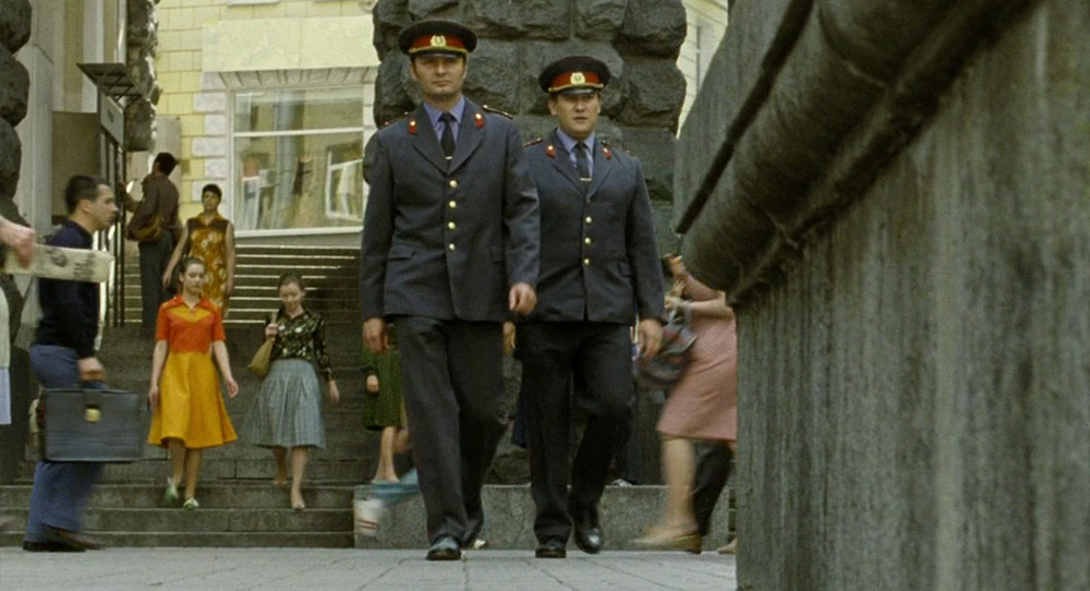 The readers of the Hungarian version (some of whom studied in Moscow at that time) also list a number of anachronisms. They say it would have been unimaginable for a soldier and a girl to sit on a bench in a public park like this; some babushka would have immediately called the police. The cars are unimaginably clean (e.g. the wheel of the kvas truck) and tuned up. And I wonder whether an 1974 poster was reprinted and used on the street even as late as 1981.