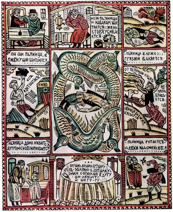 It is very interesting to observe that while in late 19th-century France and Hungary they fought against alcoholism with the rational and visual weapons of enlightenment and modern science, hundred years later in the Soviet Union, which had already had ample time and opportunity to get disenchanted with the efficiency of these tools, they turned back to several centuries old practices: the arguments of proverbs and the visual world of naive folk graphics, the lubok.