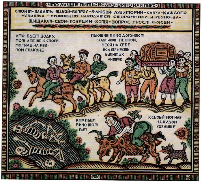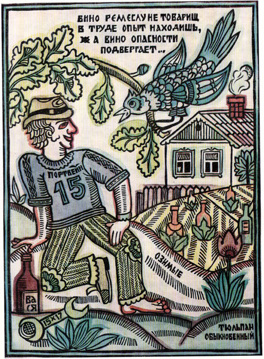 The picture book With joint forces against drunkenness, as its introduction writes, was published with the purpose of agitation for Gorbachev’s alcohol ban in 1989. Its twenty-five illustrations were signed by the members of the art school “Soviet Lubok”, established in 1982, V. V. Kondratev (2, 15, 21, 22), I. O. Puhovskaya (3, 6, 7, 9), O. A. Keleinikova (4, 12, 14, 23), V. I. Lenchin (5, 8, 24), G. M. Eskin (10, 16, 19), L. V. Podkorytova (11, 25), Yu. G. Movchin (13), V. P. Lenzin (17, 18) and S. V. Kuznetsov (20). In the “red tail” of the book, still necessary at that time to clear the authors of any ideological deviation, they explained their choice of genre by saying that they wanted to reach back to “the soul of the people”. Whether it was like this or they enjoyed rather the postmodern opportunities of the naive form, the fact is that they created a new tradition, or at least greatly contributed to the legitimation of a tradition which had been getting more and more popular since the late 70s. The influence of this work is to be discovered not so much in a radical reduction of Russian alcohol consumption, but rather in the successful works by such contemporary artists as Andrei Kuznetsov or Vladimir Kamayev.