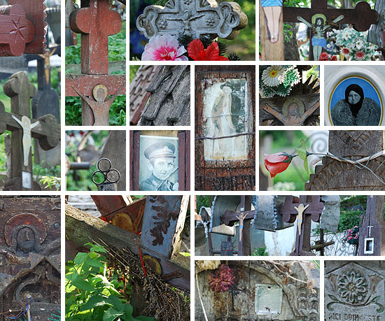 Every cemetery has its own unique motifs, copied from generation to generation and from tomb to tomb by the members of the local community; motifs, which distinguish the graveyard even from that of the next village. In Ieud these are the photographs in folk costume inserted in the legs of the crucifixes, and the multitude of tin Christs, the aesthetics of redundancy, which is characteristic also for the inside of the wooden churches, nevertheless the sight of a million little Christs puzzle the unsuspecting visitor.