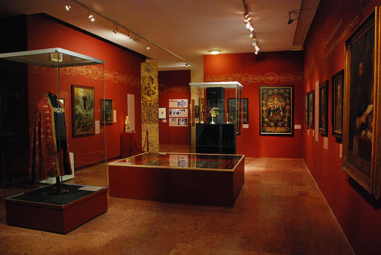 A separate room is dedicated, apparently due to the richness of the material, to the monuments of the Armenian Catholic Church in Transylvania, pontifical portraits, church dresses, votive and altar paintings. The three portraits brought from Szamosújvár/Gherla do not necessarily represent the three greatest personalities of the Armenian church, they could have also chosen someone else, such as Bishop Minas Zilifdarean (1610-1686), under whose leadership the Armenians migrate into Transylvania. These three lives, however, well demonstrate the large social and geographical scope of the Armenian intellectuals, and their possibilities of choice between different cultural centers. The Moldova-born Oxendio Virziresco (Verzár) (1655-1715) learned in the Propaganda Fide missionary college in Rome. After 1685 he worked on the union of the Transylvanian Armenians with the Catholic church, first in the midst of great resistance, but in the end with a complete success, and in 1690, after the end of Bishop Minas he became the church leader of the Armenians in Transylvania. Stephano Roska (1670-1739) came from an Armenian family of Kamenets-Podolsk. He was the Armenian provost of Stanislawów (now Ivano-Frankivsk), and on behalf of the Armenian archbishop of Lemberg he visited the four Transylvanian Armenian parishes, founding a number of important religious societies. Mihály Theodorovicz (1690-1760) was born in Bistritz/Beszterce/Bistrița, at that time an important Armenian settlement, and he became from a shop assistant the Archdeacon of Szamosújvár. He built the first Armenian stone church, the Salamon church (1723-25), and he introduced the Gregorian calendar. Maria Theresa appointed him bishop, but eventually it did not receive an ecclesiastical approval: it is since then that the Transylvanian Armenian community has belonged under the Roman Catholic bishop of Gyulafehérvár/Alba Iulia.