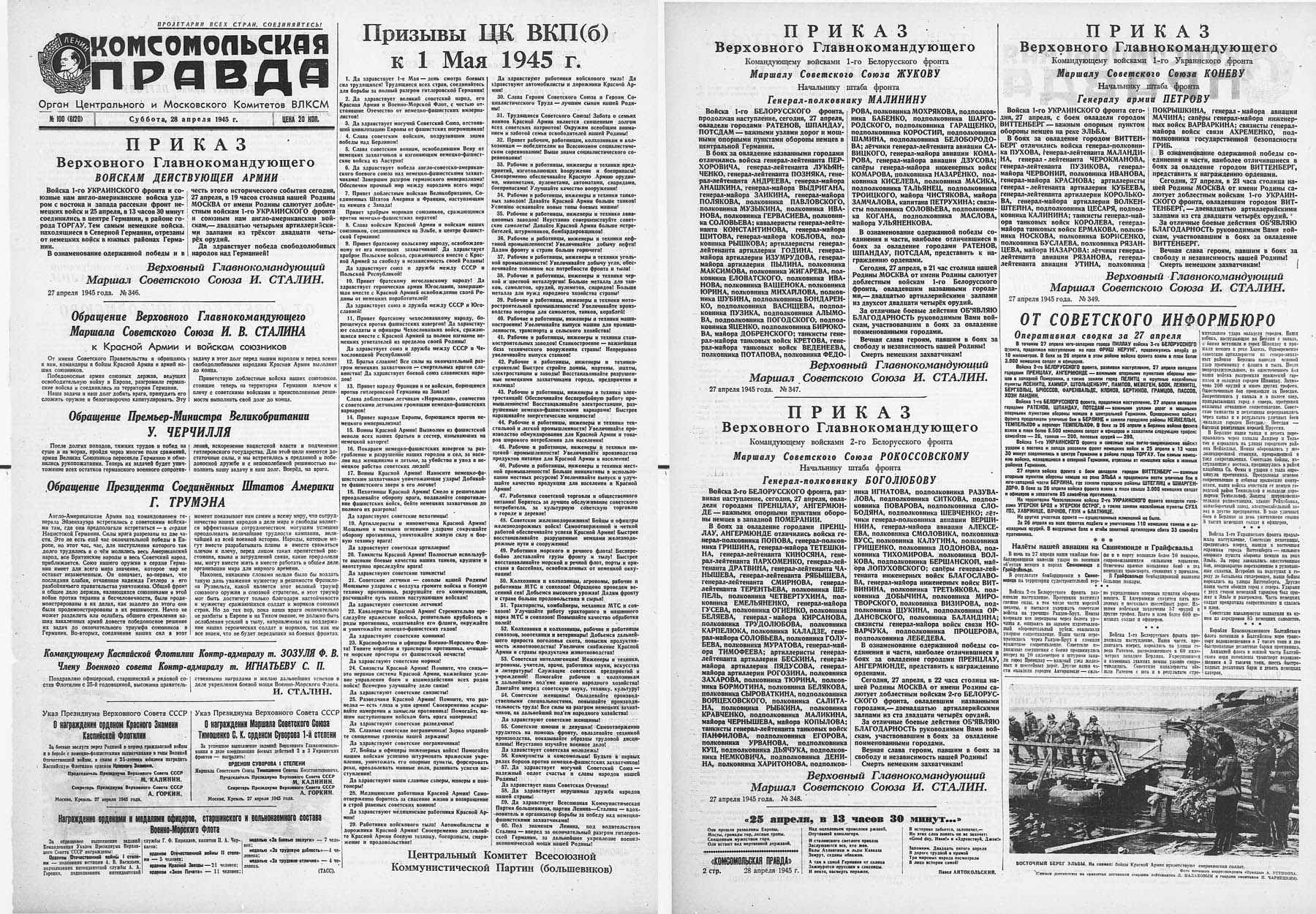 The front page of the Komsomolskaya Pravda from 28 April, shown above, features official letters of congratulations from the leaders of the three allied nations – from Stalin, Churchill and Truman. Before this, goes the order of the supreme commander-in-chief Stalin to fire a salute of 24 salvoes from 324 cannons on 27 April 1945 as a tribute to the participants of the historical event – 1st Ukrainian Front and Anglo-American troops.