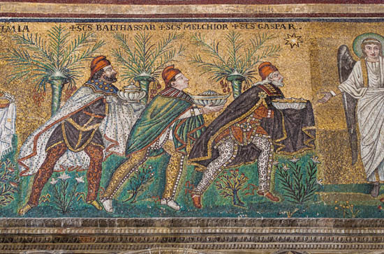Las biblias en español posteriores a la conocida como Biblia del Oso que aquí utilizamos (trad. de Casiodoro de Reina, Basilea, 1569) mencionan siempre a estos hombres sabios como «magos» —siguiendo el μάγοι del griego original, y el magi de la Vulgata. Una nota al margen puesta por Casiodoro nos da información valiosa acerca del término «magos». Dice que eran: «Personas illustres de una de las Provincias de Media cuya gente se llamavan Magos». Y, en efecto ya en tiempos de Mateo la palabra griega tenía dos significados. Uno era «mago», como Simón el mago (más bien, brujo) que aparece en los Hechos de los Apóstoles. Y el otro, el primitivo, era el que hemos visto algo burdamente anotado en la Biblia del Oso como procedente de Persia: en efecto, se llamaba así a los sacerdotes de Zoroastro y, más en general, a los astrónomos persas. Los persas zoroastrianos también tenían su propia tradición de un Salvador que estaba por venir, y el Evangelio sugiere —cosa que los apócrifos sirios y armenios luego amplían en detalle— que reconocieron como tal a Jesús. Esta es la razón por la que los Magos están representados aún en el siglo V con ropaje persa y sombreros distintivos de aquel reino. Es un curioso giro de la historia que, según la tradición, el ejército persa que devastó Tierra Santa durante la Guerra Bizantino-Persa respetara la iglesia de Belén porque en su puerta había tres característicos magos persas portando regalos al Salvador recién nacido.