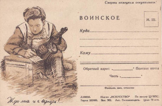 | Жди меня, и я вернусь. Только очень жди, Жди, когда наводят грусть Желтые дожди, Жди, когда снега метут, Жди, когда жара, Жди, когда других не ждут, Позабыв вчера. Жди, когда из дальних мест Писем не придет, Жди, когда уж надоест Всем, кто вместе ждет. Жди меня, и я вернусь, Не желай добра Всем, кто знает наизусть, Что забыть пора. Пусть поверят сын и мать В то, что нет меня, Пусть друзья устанут ждать, Сядут у огня, Выпьют горькое вино На помин души... Жди. И с ними заодно Выпить не спеши. Жди меня, и я вернусь, Всем смертям назло. Кто не ждал меня, тот пусть Скажет: - Повезло. Не понять, не ждавшим им, Как среди огня Ожиданием своим Ты спасла меня. Как я выжил, будем знать Только мы с тобой,- Просто ты умела ждать, Как никто другой. | Wait for me, and I’ll come back! Wait with all you’ve got! Wait, when dreary yellow rains Tell you, you should not. Wait when snow is falling fast, Wait when summer’s hot, Wait when yesterdays are past, Others are forgot. Wait, when from that far-off place, Letters don’t arrive. Wait, when those with whom you wait Doubt if I’m alive. Wait for me, and I’ll come back! Wait in patience yet When they tell you off by heart That you should forget. Even when my dearest ones Say that I am lost, Even when my friends give up, Sit and count the cost, Drink a glass of bitter wine To the fallen friend – Wait! And do not drink with them! Wait until the end! Wait for me and I’ll come back, Dodging every fate! “What a bit of luck!” they’ll say, Those that would not wait. They will never understand How amidst the strife, By your waiting for me, dear, You had saved my life. Only you and I will know How you got me through. Simply – you knew how to wait – No one else but you. |