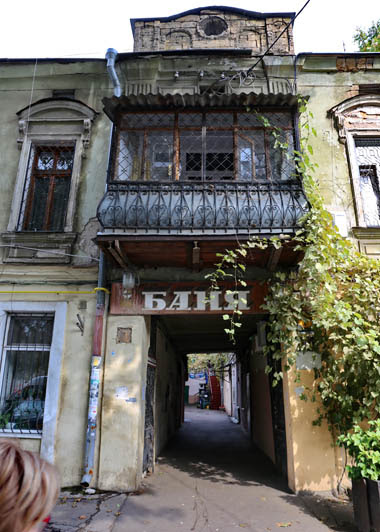 At the end of a courtyard overgrown with grapes, beneath the stairs leading up to the bath, young men are standing and chatting. “Shalom”, they greet us: apparently, foreigners here automatically means a former compatriot coming back from Israel. We reply in Russian, and social life immediately starts. They draw our attention to the black marble plaque on the courtyard wall. This commemorates “Karabas”, the local mafia boss shot in 1997 here, “on the stairs, as he was coming down from the bath”, they point out. “He was like Mishka Yaponchik”, they say with reverence, although they were not personally directed by him, they only heard of him from their older colleagues. Mishka Yaponchik, the Jewish gangster boss of the early 20th century, who was the model for Isaak Babel’s Benya Krik, the “King” of Moldavanka, in his Odessa Tales, lives so fresh in the memory of the posterity of Moldavanka, to an extent that we, readers of Odessa Tales, would never think.