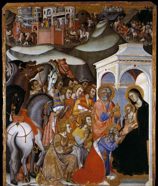 An earlier example of the style: Bartolo di Fredi: Adoration of the Magi, 1375-85, originally in the Duomo of Siena, today in Siena’s Pinacoteca Nazionale