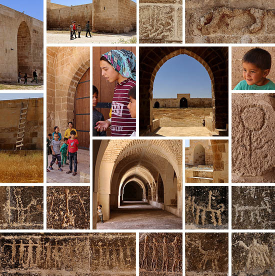 After Harran, our next stop is Han el-Barur, “the Caravanserai of the Well”, located thirty kilometers to the east. The caravanserai was built in 1229 by Husam ed-Din Ali, probably a local Ayyubid provincial chief. On its façade, to the right of the gate, there was a lion, the royal animal of Persian origin of the medieval Mesopotamian dynasties, whose belly and legs are only visible now. The well has long since dried up, but today there is no more need for it, because the water comes from the swollen Euphrates through canals and pipes. The resulting increase of population is flocking to us from the surrounding farms within minutes. Among them, a teenage girl brings a key and opens the gate. The courtyard of the caravanserai is a spacious, empty square space. A vaulted corridor runs around it on four sides, where people and animals stayed once. The entire building has been over-restored according to Turkish custom, as is evident from the fact that two vault sections were left unpolished, and the original surface is full of graffiti accumulated over the centuries: horsemen, camel with her foal, men dancing in circles. It is painful to imagine how much history might have been removed from the other four dozen vault sections under the name of “restoration”.