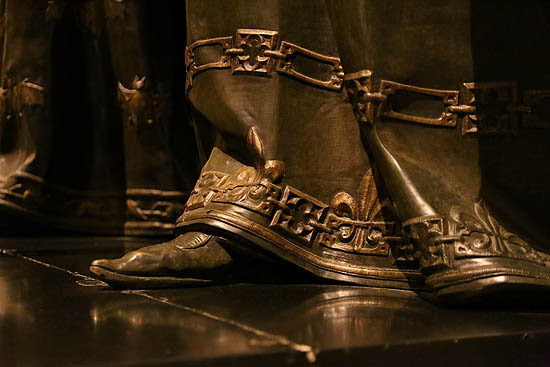 León, whose name comes not from the lion but from the Roman Legio VI, as is proved by its medieval name regnum Legionense, proudly displays the beast nonetheless, along with scallop shells for Galicia and pomegranates for Granada. His cross-tipped spear pierces a pomegranate — a direct allusion to Granada’s conquest in 1492, the same year Columbus set sail