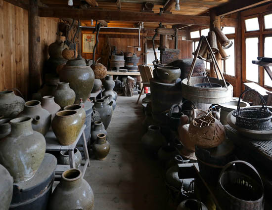 En lugar de taburetes o sillas, el alambique está rodeado de enormes tinajas llenas del producto final, marcadas con el carácter 酒 jiŭ, «bebida». Las jarras, junto con calabazas secas, cestas, instrumentos y carteles caligráficos, se apiñan dando al local un aire de anticuario o pequeño museo, como ocurre en Ma’an, un barrio del pueblo dong de Chengyang.