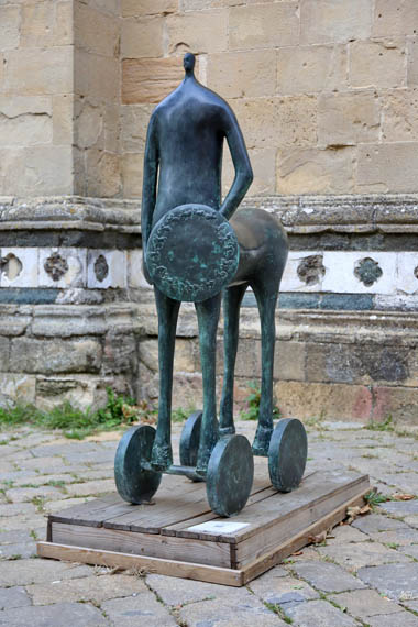 Allí están, en la plaza mayor del casco antiguo, junto a la puerta del ayuntamiento, frente a la iglesia de San Miguel, junto al lavadero medieval, en el museo etrusco y en el claustro de la pinacoteca. Hombres, mujeres y caballos. Parecen las figuras grotescas de László Réber: tan indefensos, y sin embargo protectores, como si fueran ángeles, o quizá los genios de una mitología etrusca olvidada, las figuras gastadas e impersonales de los pequeños sarcófagos del museo etrusco.