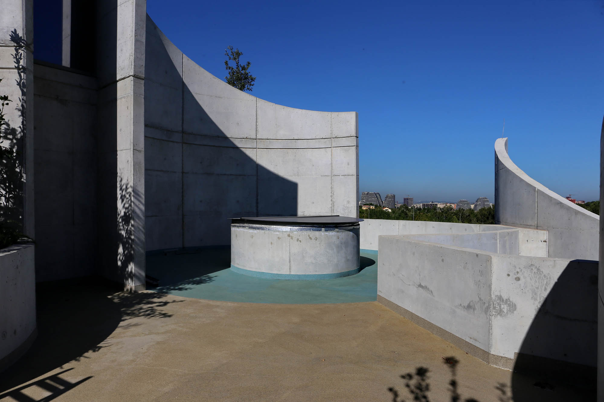 The two rooftop terraces are defined by the same concave “sails,” wrapping around raised planters and connecting seamlessly with the surrounding environment. Here, it becomes clear that the choice of concrete was far from arbitrary—it harmonizes beautifully with the neighboring buildings. We are in one of Tirana’s most elegant districts, where modern residential blocks rise gently among rolling hills. Several prominent international architectural firms have left their mark here with bold structures. The hospital fits in perfectly, yet its sinuous curves allow it to stand apart, like a monumental Henry Moore sculpture in the middle of the city.